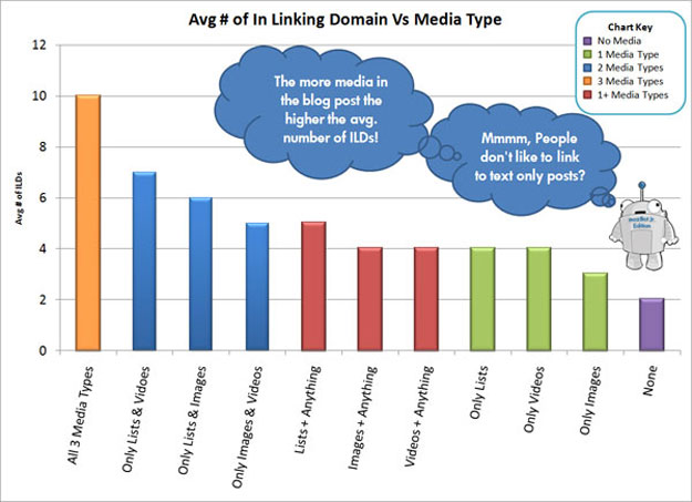 Many factors go into creating a linkable post, but what stands out is the variety of media you use. Below is a list of the types of media that work well when writing both basic weekly posts and those posts you do once a quarter that are intended to go viral. Moz lists these media types in descending order, from most beneficial to least in terms of creating links. (The same is likely true for social shares.) While this data was based on an Moz’s content, it seems to make sense for many sites. However, look at your own analytics to determine the type of posts that drive engagement, links, and shares on your own blog.