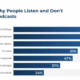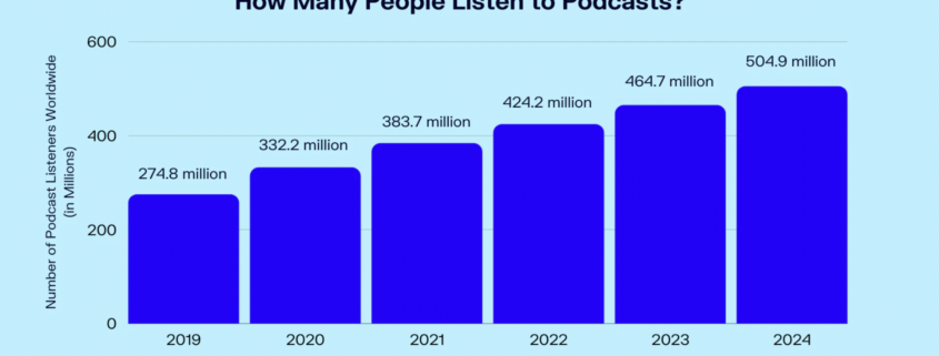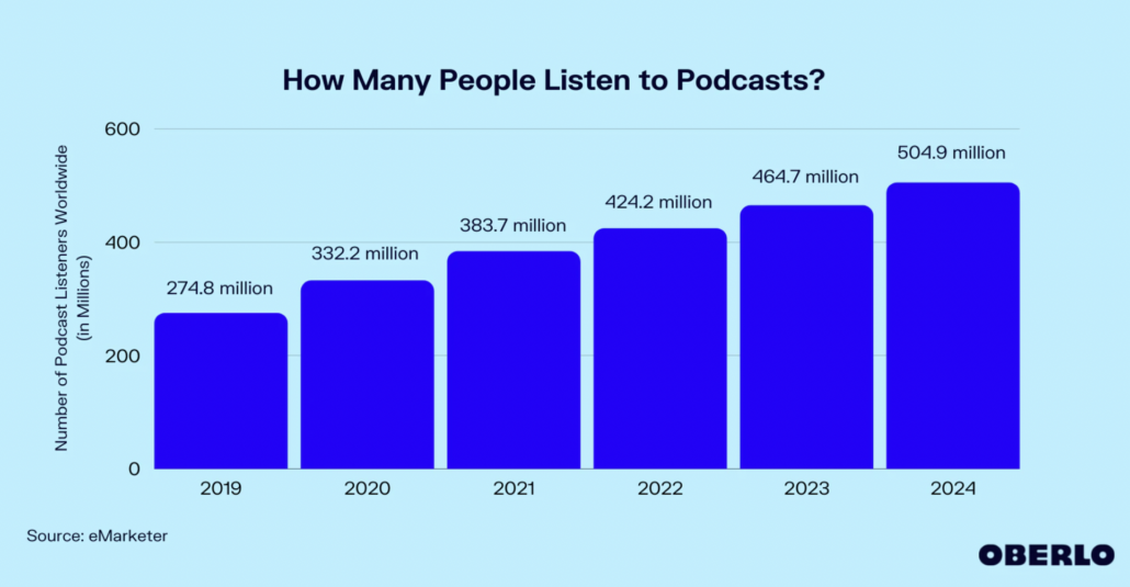 Podcasting popularity is a bit more modest. About 500 million people listen to podcasts, although that number has shot up more than 80% alone over the past five years.