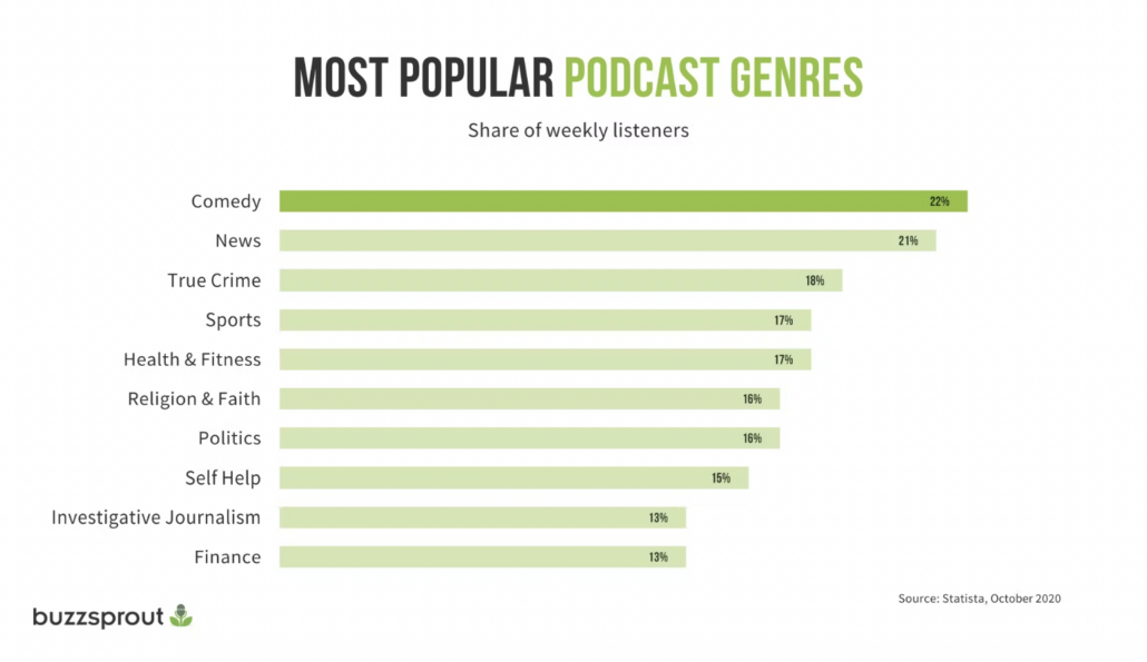 Here’s a look at the most popular podcast genres based on weekly listeners.