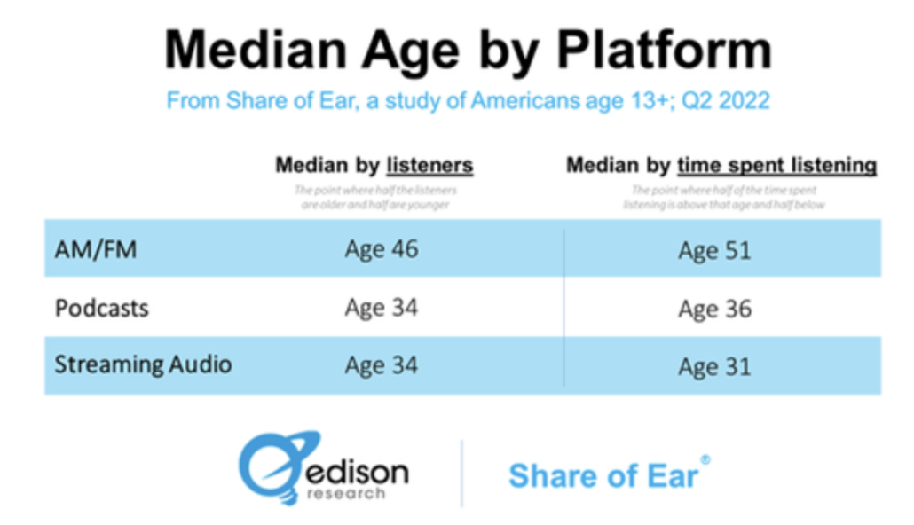 By comparison, we can see that the average age of people who consume the most radio content is older than podcast listeners and streamers.