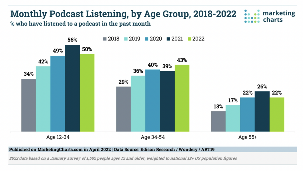 Here’s a closer look at the distribution of podcast listeners by age group over the past five years: