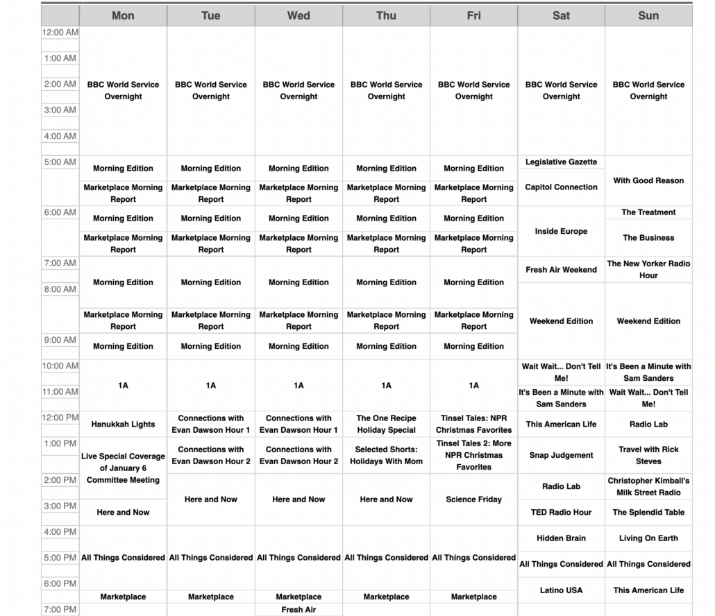 Here’s an example radio schedule of news and talk radio from NPR.