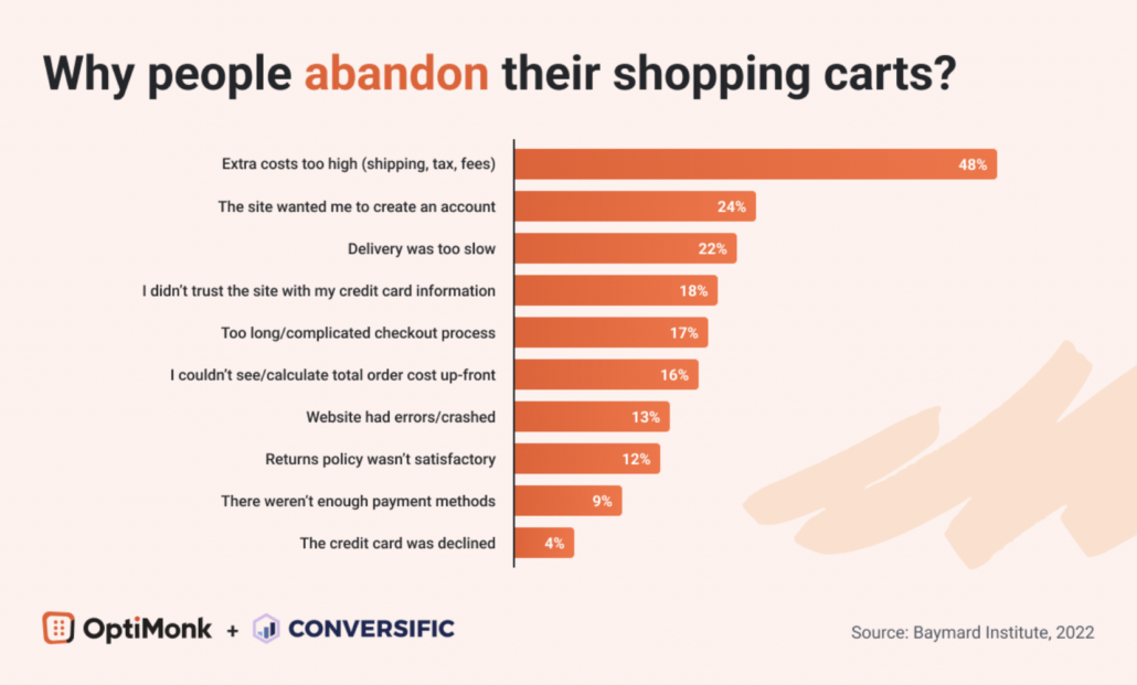 24% of people abandon carts because they needed to create an account. That was the second highest response. An additional 17% of people said the process was too long and complicated.