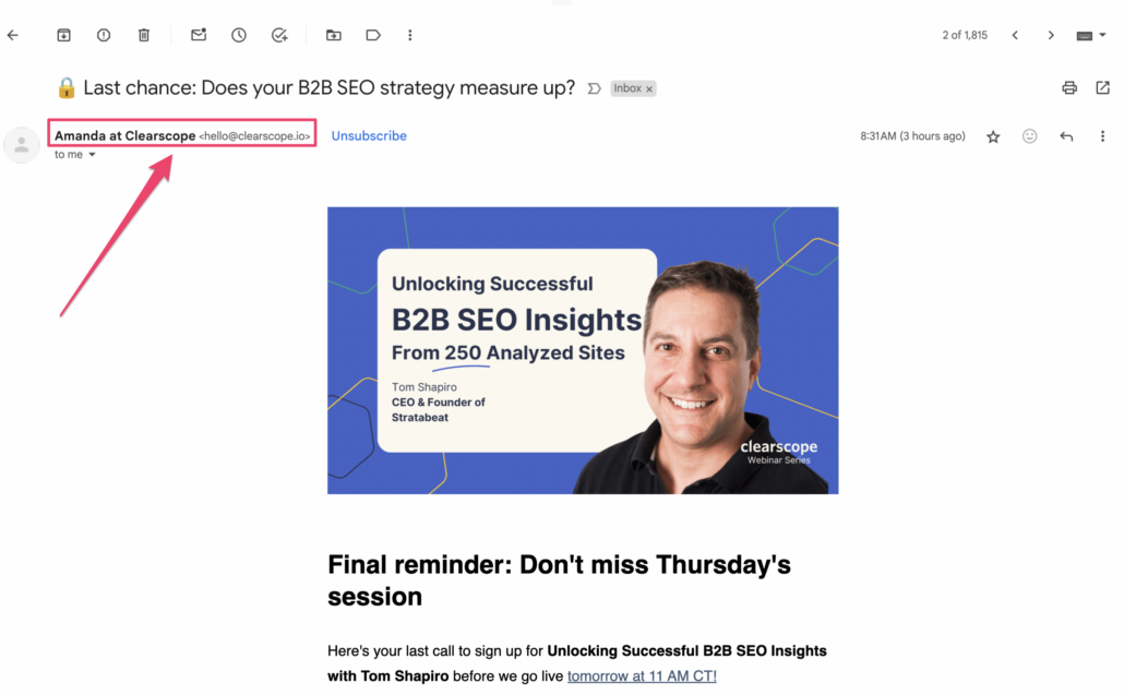Look at this example above. The “from” line is “Amanda at Clearscope” (even though the address itself is from a generic company company email).