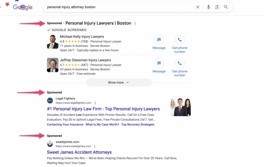 PPC ads come in all different shapes and sizes. But the one we see most often is facilitated through search engines. When you Google certain terms, you’ll see ads appearing at the top of the organic results. But we also see PPC ads run on social media platforms and through display ads directly on websites.