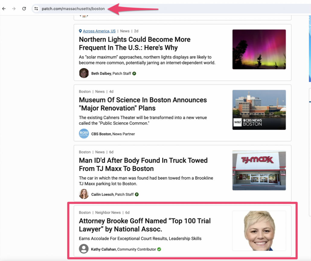 Here’s an example I found from this past week of a Boston Lawyer getting featured locally on Patch for a national achievement. The national recognition is cool, but the local story will have a far bigger impact on this firm.