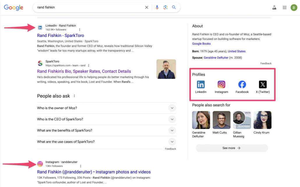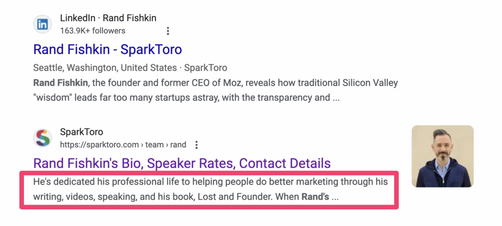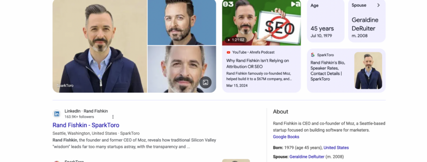 So we can see that his LinkedIn profile appears before his business. However, we can also see that a photo used on SparkToro (the second result) is the primary image that’s being show to us as well.