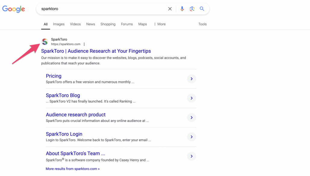 But we do have the favicon displayed, which is the SparkToro logo. This is definitely something that’s important to have for your website, as it directly aligns with your branding in the SERPs.