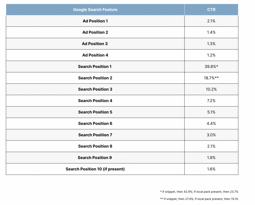 Here are some other ideas to get you thinking about ROI. FirstPageSage just published a 2024 study about the CTR of Google’s top positions in the SERPs. Here’s what they found: