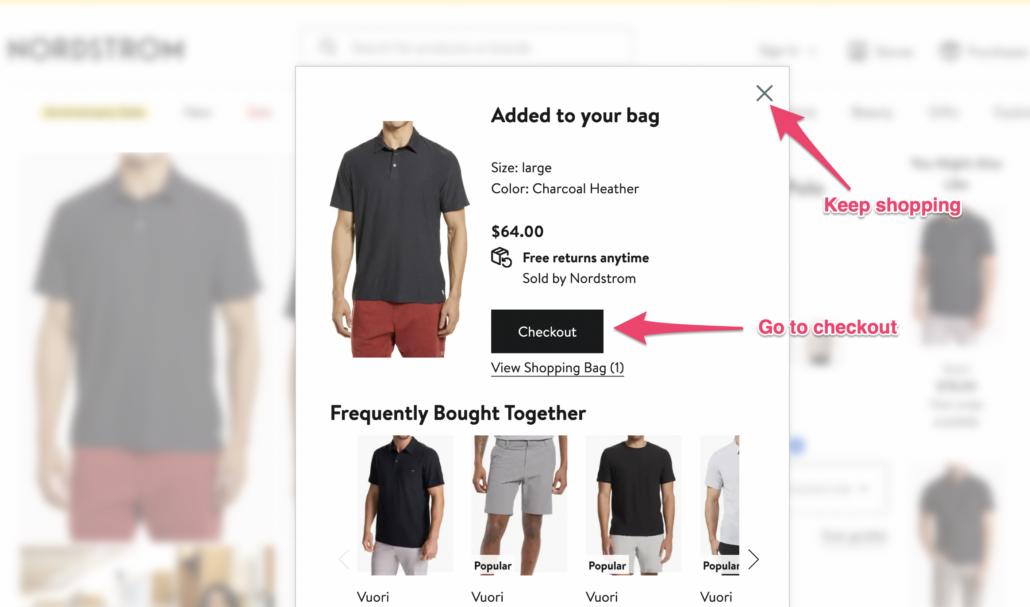 As soon as an item is added to the cart, a pop-up prompts the buyer to either navigate to the checkout page or close the box to continue browsing.