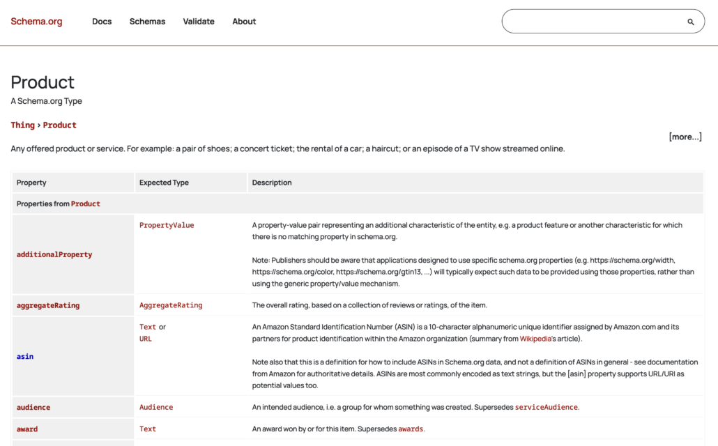 Ecommerce sites will benefit from the product documentation on Schema.org. Here’s a small taste of the dozens of different properties you can use.