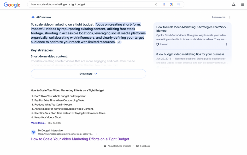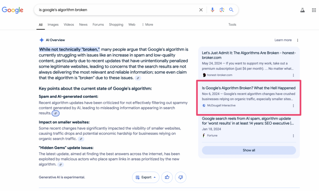 Having your content used in the AI Overview is also a bit of a double-edged sword—as if the AI does a good enough job providing the answer, then you may not get any traffic.