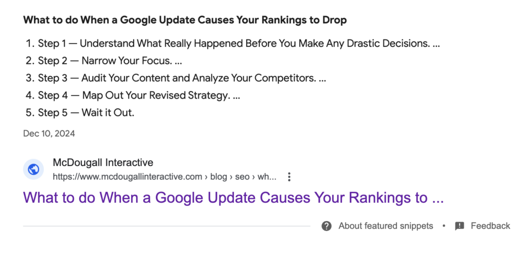 For example, here’s a recent post I wrote about what to do when a Google update causes your rankings to drop that earned a featured snippet spot.