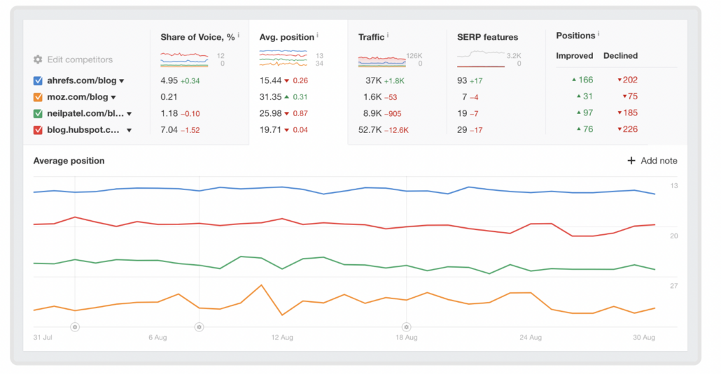 With the rank tracker feature, you can simply import a list of your keywords, pick your competitors, and Ahrefs will automatically track that information over time. There’s also a competitive overview chart that shows exactly how your positions are changing in the SERPs compared to your top competitors.