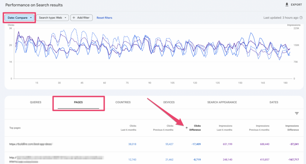 Then navigate to the “Pages” tab and sort the data “Clicks Differences” to see if one or two URLs have lost more traffic than the rest.