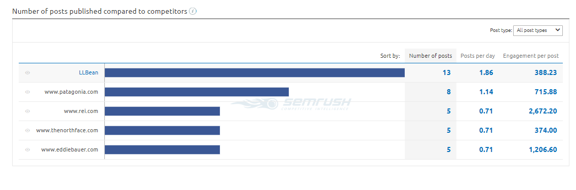 At the bottom of the page you can see the number of posts you posted within the specified dates compared to your competitors. For example, for the past week L.L. Bean had a total rate of 1.86 posts a day with an engagement per post rate of 388.23 while REI only had a post per day rate of .71, the engagement rate was much higher at 2,672.20 engagements per post.