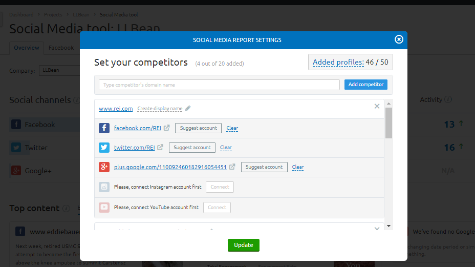 When it comes to setting up your tool, once you add your own social channels – you are ready to start adding competitors. You are able to add up to 10 competitors to your account that hold 5 social channels for each competitor (Facebook, Twitter, Instagram, YouTube and Google Plus). That’s a total of 50 social media accounts with one SEMrush account