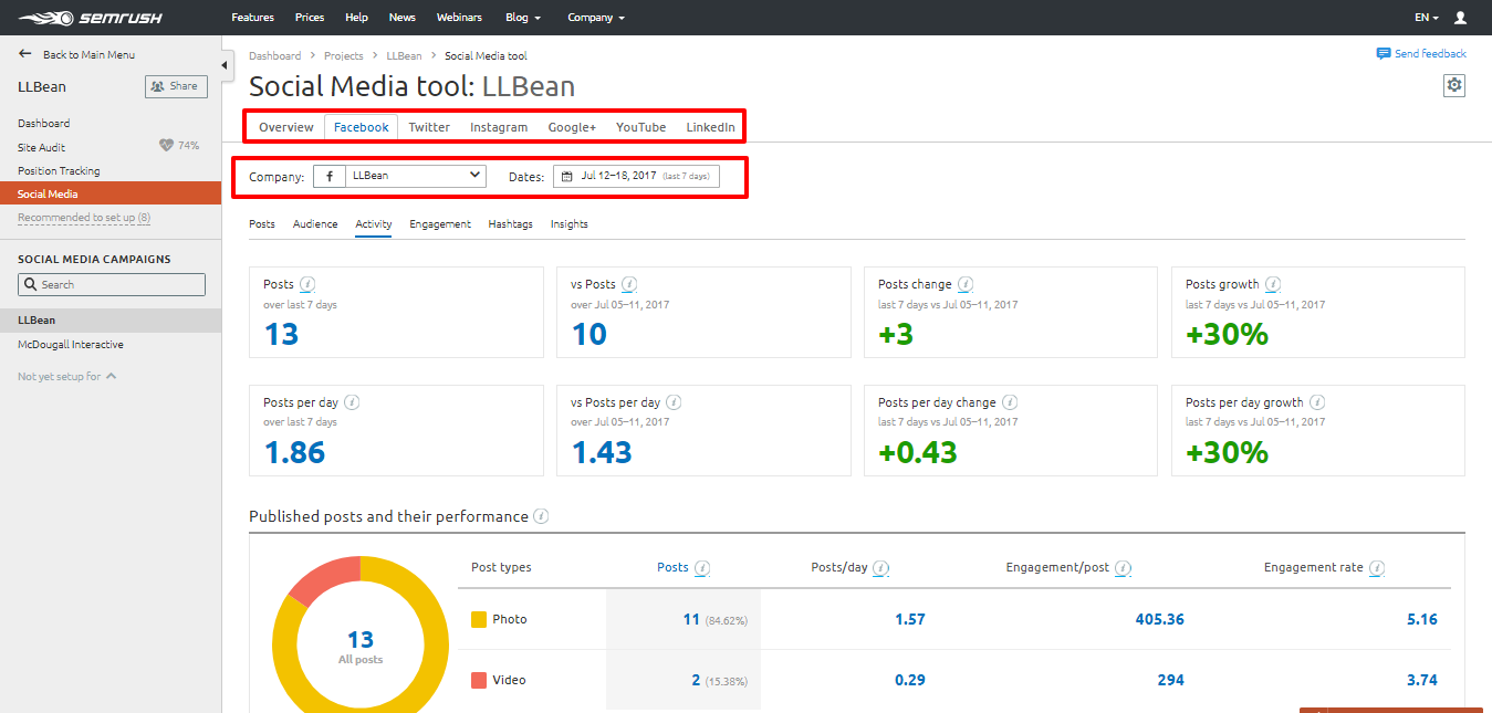 The best thing about SEMrush is that you are able to analyze the results that YOU want. If you wanted to only analyze a company’s Instagram and YouTube accounts compared to your own– just set up your accounts through the tool and then add your competitors Instagram and YouTube accounts. There are no hoops to jump through or do beforehand.