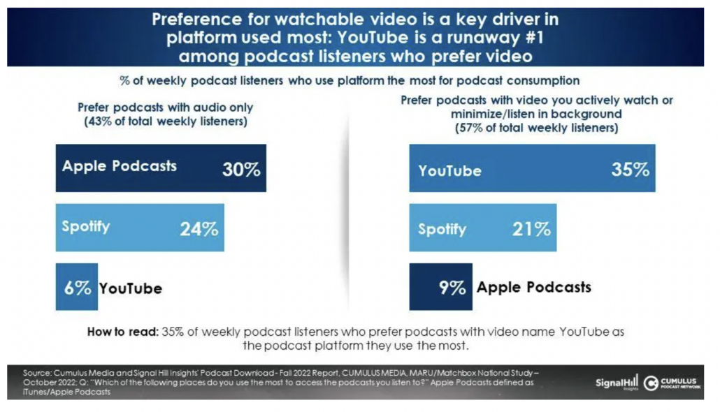 In fact, 55% of people said they associate YouTube as a place where they can watch and listen to podcasts. Just 18% of survey respondents said the same for Spotify, and that number drops to 14% for Apple Podcasts.