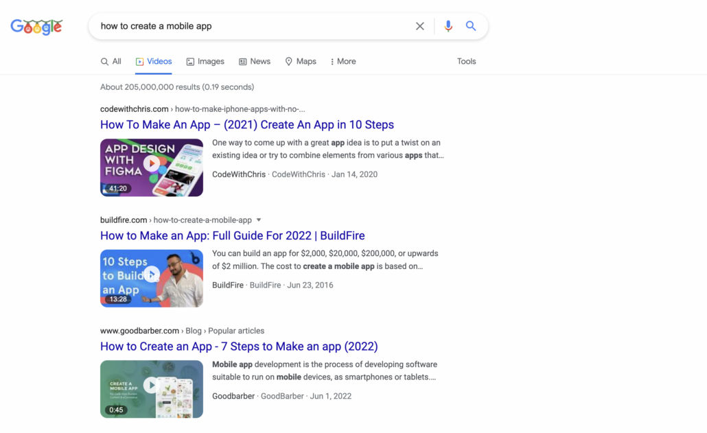 In the example above, you can see that the thumbnail for Code With Chris is about designing an app with Figma, and BuildFire’s thumbnail is about creating an app in ten steps.