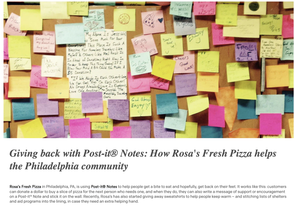 Instead of promoting the many uses of Post-it notes, they made their customer, Rosas Fresh Pizza, the hero of their marketing campaign.