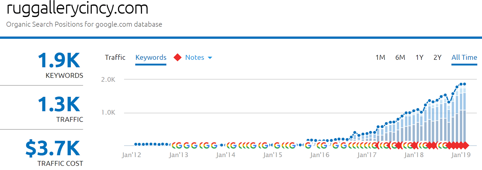 Sam runs a small business and is not on one of our comprehensive programs, but even consistently doing quality podcasts and videos has given him a boost of over 1,800 keywords driving traffic.